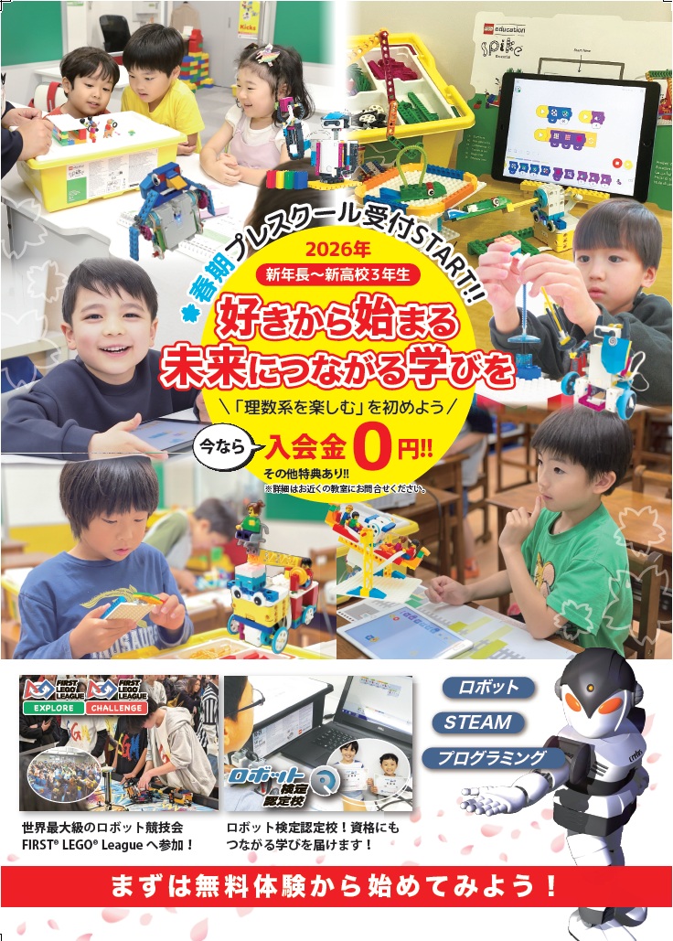 当校の学びにご関心をお寄せいただきありがとうございます。子どもたちが自ら考え、挑戦し、達成する喜びを実感できる場づくりを大切にしています。ロボット製作やプログラミングを通して育まれる創造力や論理的思考力は、未来を切り拓く力につながります。これからも一人ひとりの成長に寄り添い、安心して学べる教室を目指してまいります。